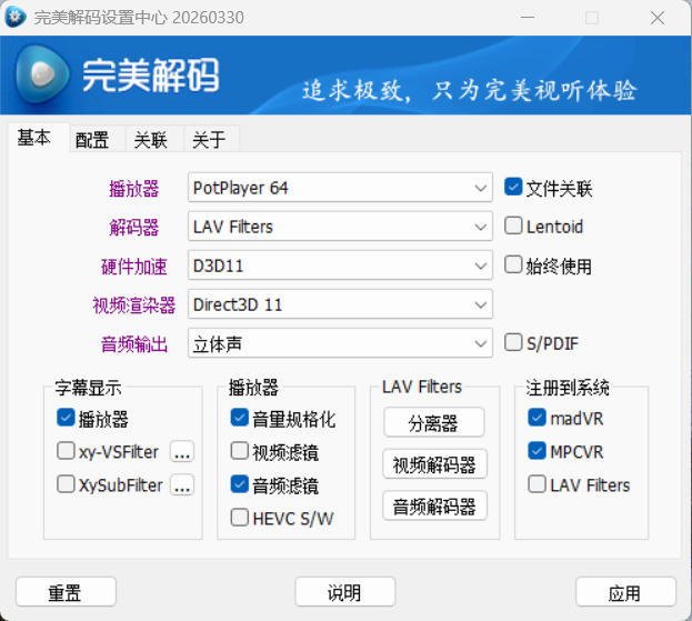 完美解码是一款由国内开发者推出的免费无广告影音整合套件。它并非独立播放器,而是集成了 PotPlayer、MPC-BE 等主流内核,并打包了 LAV Filters、MADVR 等专业解码与渲染组件。